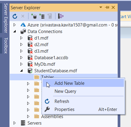 If the database doesn’t exist, click on the “Yes” option to create it. Now the database is visible in the Server Explorer. Further, expand the database and click on the Tables folder. After that right-click on the Add New Table option. The following figure demonstrates it.