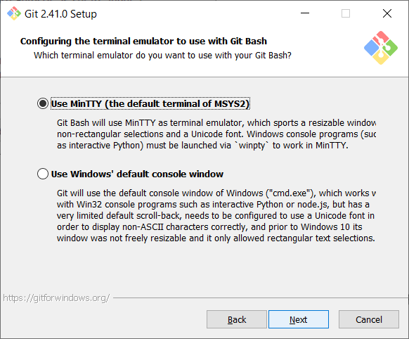 Since, by default Git uses MinTTY terminal emulator. So keep the default and click on next.