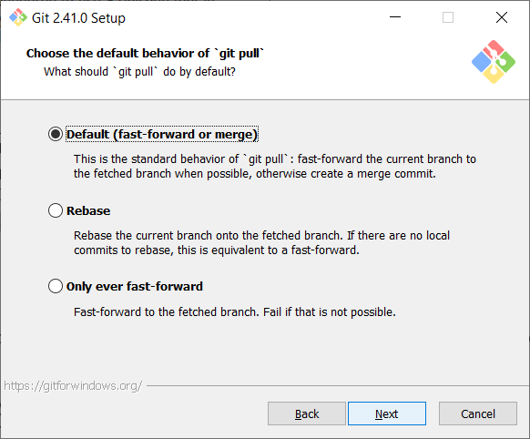 Further, keep default for standard behavior of Git pull and click on next.