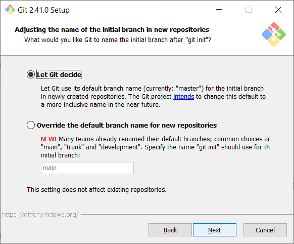 Let the initial branch name decided by Git. So click on next.