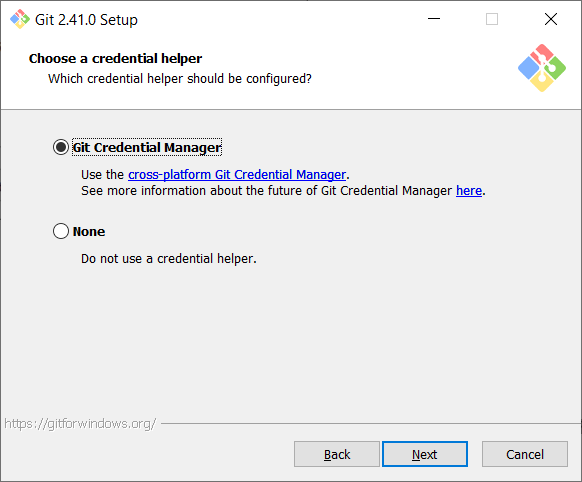 When communicating with remote Git repositories, a Git credential helper is a tool that enables Git to securely handle and preserve login credentials, saving you from having to continually enter your username and password. Git communicates with a number of remote services, including GitHub, GitLab, and Bitbucket, all of which demand authentication in order to access private repositories or carry out operations like pushing or pulling code. So, keep the default option and click on next.